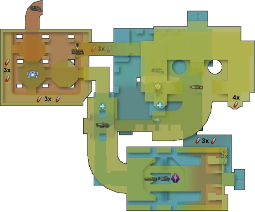 - Shock Rifle: A T-shaped corridor located south of the map that unites the Link Gun platforms, upper level of Double Damage and lower level of Lightning Gun areas. The eponymous weapon sits right in the T-junction.