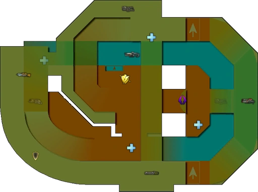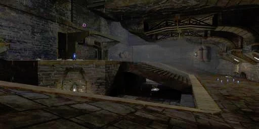 An ancient castle in ruins during a rainstorm. It contains a big, multi-story area at the east, the Great Amp Hall. It's connected at mid-level to the Great Room via a small corridor, the Great Room Hall. Above this area there's a hall, Upper Rocket Hall. At north and south, the Great Amp Hall is connected to these areas via corridors. One of these, the Mini Hall, is located south of the map, and connects to the upper bridge over the Great Room and the upper level of the Great Tower, located at the southwest of the map and comprised of two corridors in the upper and lower level, and a curved staircase uniting both. The northwest area in the upper level is the Sniper Nest, and, as expected, it houses the Lightning Gun. From the lower level of the Great Tower to the Great Amp Hall there's a corridor, also called Great Room Hall. Finally, northwest of the map, but in the lower level, there's another corridor, the Lower Flak Hall.