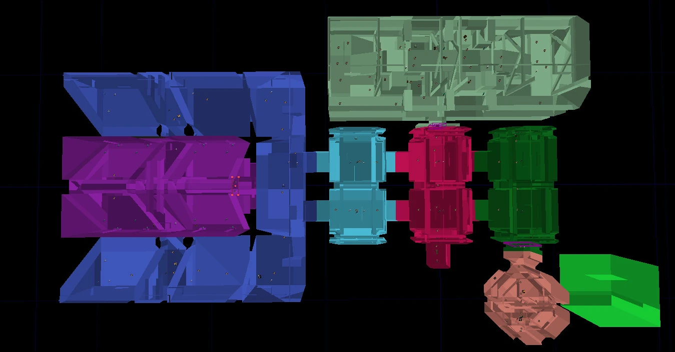 Zones of the map as seen in UnrealEd from a top-down perspective.