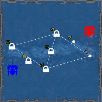 1x Blue Base, near the Power Core. 1x Red Base, near the Power Core. 1x Central Island, eastern side. 1x Central Island, western side. 1x Blue Support, near the Blue Support Node. 1x Red Support, near the Red Support Node. | |