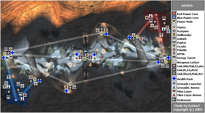 Adara is a relatively symmetrical map set in a long, deep canyon. Each power core is located at opposite corners: the Red Core is located in the Northeast corner of the map, while the Blue one is located in the Southwest corner.