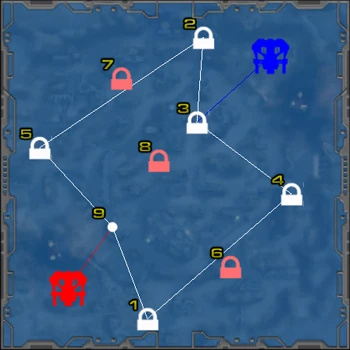 - Choke Point: Both Power Cores are connected to their Prime Nodes. The Red Power Core is also connected to the Middle South Node, while the Blue Power Core is connected to the Northeast Node. All four Nodes are also connected to the Center Node.