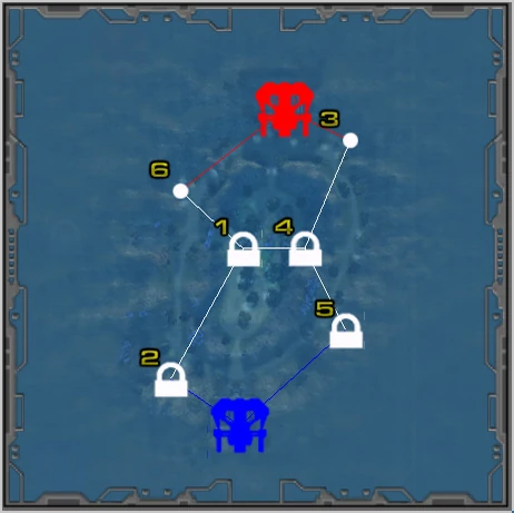 - Choke Point: Red Power Core ➡ Red West Prime Node (6) OR Red East Prime Node (3) ➡ Central West Node (1) ➡ Central East Node (4) ➡ Blue West Prime Node (2) OR Blue East Prime Node (5) ➡ Blue Power Core.