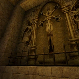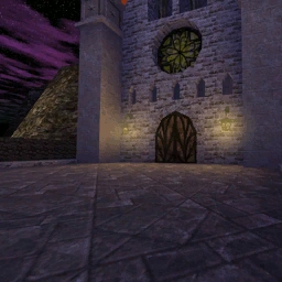 - The original intention to get to the monk statues with items hidden in them was most likely to destroy the cross on top of the church, which is/was a mover that moves out of the way just like the glass in this map technically. But it was possibly seen as too much, so a pushable brick was added instead, while the original hint was in the cross mural.