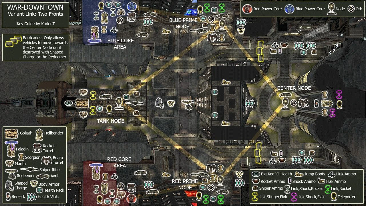 | WAR-Avalanche • WAR-Downtown • WAR-Dusk • WAR-Floodgate • WAR-Islander • WAR-Islander_Necris • WAR-MarketDistrict • WAR-OnyxCoast • WAR-PowerSurge • WAR-Serenity • WAR-Serenity_Necris • WAR-Sinkhole • WAR-TankCrossing • WAR-Torlan • WAR-Torlan_Necris Xbox 360 maps: WAR-ColdHarbor • WAR-Downtown_Necris Titan Pack maps: WAR-Confrontation • WAR-Hostile Special maps: WAR-Torlan_Leviathan |