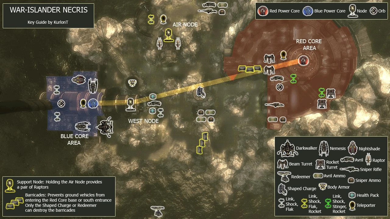 Even though they build this level up like Armageddon, it's not so bad. You can do pretty much whatever you want on this level. The Necris will sometimes leave vehicles abandoned outside the entrance to the Air Node, allowing you to hijack them (especially the Nemesis) and use it to shoot at their nodes\core from obscure places. Most notably, you can use the Nemesis to destroy the air node from ground-level if you position yourself behind the rocks in front of their base. You can shoot up into the prime node from ground level down below, and you can also park next to the ramp leading up to their prime node and shoot their power core.